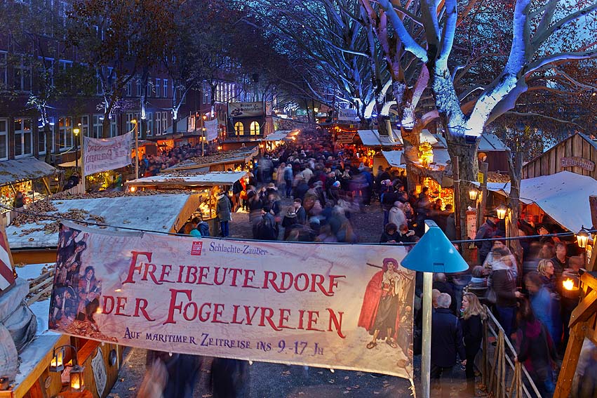 Rund um das Bremer Rathaus zwischen Stadtmusikanten, Dom und Schütting entsteht ein zauberhaftes Dorf, das die Vorfreude auf das Fest der Liebe steigert. Zahlreiche Stände versetzen Besucher aus nah und fern in vorweihnachtliche Stimmung und laden zum Verweilen, Klönen und Glühwein trinken ein. Kunsthandwerk, Pralinen, Wollwaren oder Kerzen – der Weihnachtsmarkt bietet Besuchern jede Menge Inspiration für die Geschenke unter dem Tannenbaum. In der Mitte des Marktplatzes steht ein historisches Karussell, mit dem Kinder ihre Runden drehen, während Eltern kulinarische Köstlichkeiten und weihnachtliche Spezialitäten probieren können. Nach einem kleinen Spaziergang durch die Obernstraße und der Überquerung der Martinistraße landen Besucherinnen und Besucher direkt auf dem Schlachte-Zauber. Historisch, winterlich und maritim - Gleich hinter dem Eingang beginnt eine Zeitreise zurück ins Mittelalter. Die zahlreichen Bäume am Ufer und die ankernden Schiffe auf der Weser erstrahlen im eisblauen Licht. An den liebevoll gestalteten Holzhütten bieten Kunsthandwerker ihre individuellen Geschenkideen an. Angekommen an den mächtigen Holzpalisaden finden die Gäste das Freibeuterdorf: Hier warten schon Schmied, Filzer oder Kerzenzieher, die dort wie vor hunderten Jahren ihre Handwerkskunst anbieten. Ob Räuberspieße, Fruchtwein oder deftiges Brot – Speis und Trank gibt es an den Piratenschenken und Tavernen.